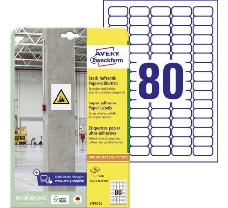 Etikety univerzálne 35,6x16,9mm Avery A4, silne lepivé 20 hárkov